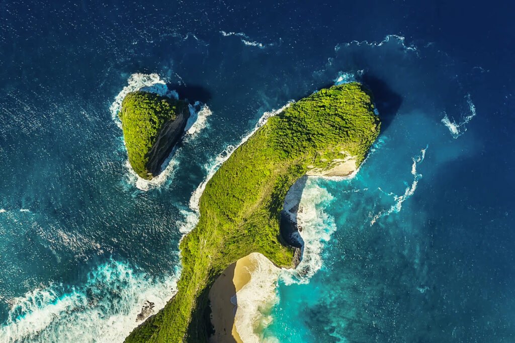 Dream Beach cliffside view with turquoise waves crashing on white sand, Nusa Lembongan Bali.